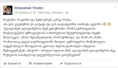 А на следующий день, 19 ноября, Тина Хидашели сама подтвердила, что она – не только мой друг на Facebook, но и преданная моя читательница, прокомментировав посвящённую ей публикацию следующим образом: «Почему да зачем, но память – вещь хорошая. А ну-ка, кому принадлежит эта цитата и чью отставку просит её автор (два smile «эмоция»). «Владимир Владимирович! Думается, что подавляющее большинство граждан Грузии с радостью бы присоединилось к нашему поздравлению, если бы у них была такая возможность и если бы не страх, которым сегодня отравлена вся атмосфера в Грузии. На вас смотрят с надеждой люди доброй воли всего мира, поэтому – полный вперёд, Владимир Путин, и долгая Вам лета во славу России!».